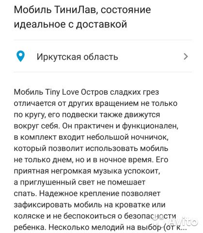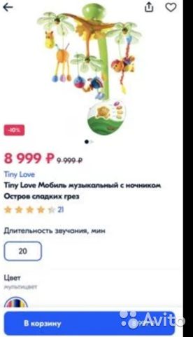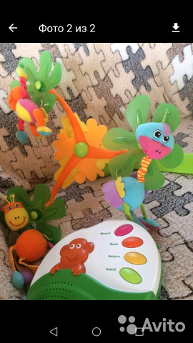 Мобиль 4 красивые и спокойные мелодии,как песенки проиграют, автоматически отключается.Яркие подвесные игрушки переворачиваются при вращении, что занимает ребеночка надолго.Можно мелодию сделать потише. Описание смотрите в фото. Покупали в Детском мире. Использовался бережно. Есть Ночник.Фирма Tiny Love. М-н Юбилейный.